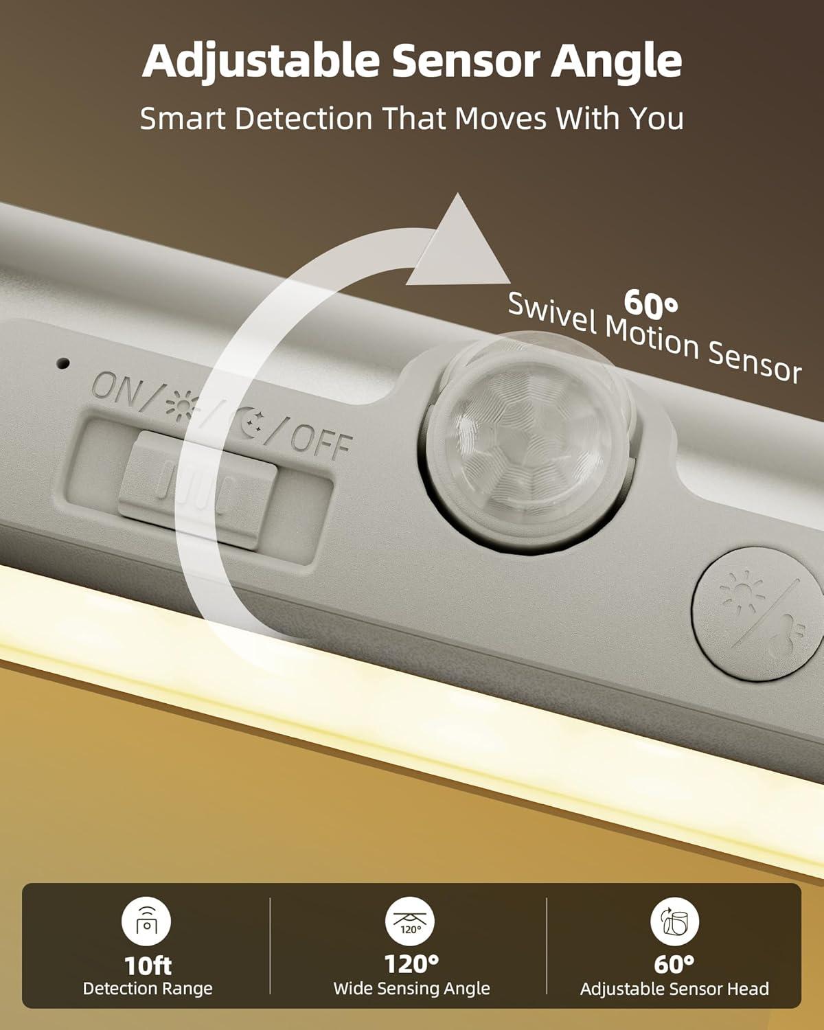 Upgraded Motion Sensor & 3 Modes: With a 60° rotatable sensor head and 120° detection angle, this closet lighting covers up to 13 ft of auto-on range. Aim detection where you need it—toward the closet entrance, down for kids, or up for high shelves. Supports 3 modes: On (continuous), Day (motion in any light), and Night (only in darkness). Shuts off after 20s to save energy—no more fumbling for switches at night.