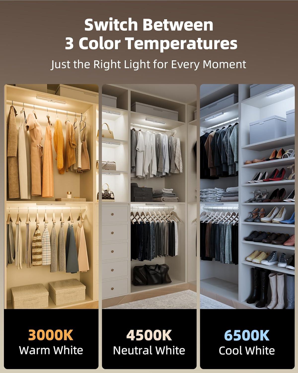 Customizable Lighting & High CRI: This LED light for closet provides 100 lumens of brightness with stepless dimming from 10% to 100%. You can set the perfect light for any need. Choose warm white (3500K) for soft night light use, natural white (4500K) for outfit matching, or cool white (6500K) for clear visibility. High 90+ CRI ensures true, vibrant colors.